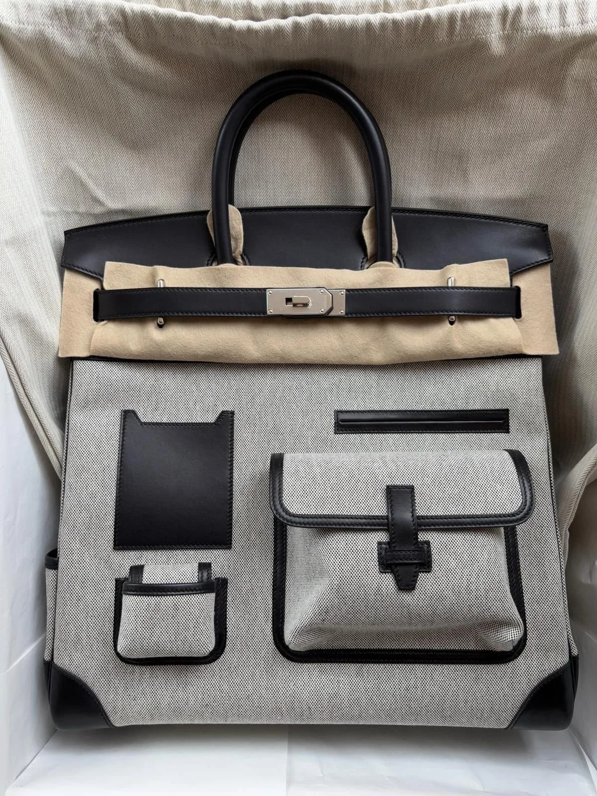 Sac 40 cm en toile Panda blanc/noir et cuir Swift noir, avec finitions palladium. Style utilitaire Cargo : poches extérieures et porte-gobelet amovible. Idéal pour voyager ou un usage quotidien, pratique et design.
